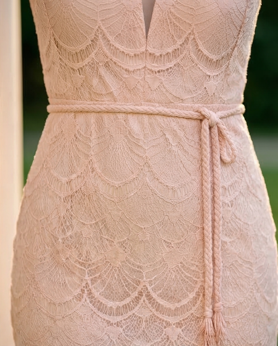 Η εσωτερική φόδρα διαγράφεται απαλά μέσα από τη διάτρητη δαντέλα, δημιουργώντας ένα αποτέλεσμα που είναι διακριτικά αισθησιακό χωρίς υπερβολή. Η διακοσμητική ζώνη, ραμμένη στο φόρεμα, τονίζει όμορφα τη μέση και αναδεικνύει τη σιλουέτα.